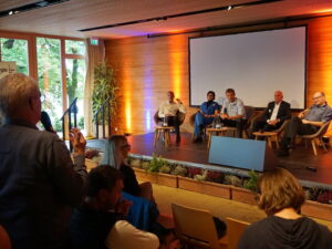 Welche Möglichkeiten für Beteiligungen gibt es? Referent*innen aus Österreich und der Schweiz gaben motivierende und inspirierende Antworten. Klar wurde: Nicht jedes Konzept passt für alle. Aber für alle Konzepte gilt: Sie sind ein Gewinn für jeden. Mit Blick auf Klimawandelfolgekosten seien „erneuerbare Energien der günstigste Weg, den unsere Volkswirtschaft gehen kann“, betonte Prof. Sterner. Dennoch könnten die politischen Rahmenbedingungen günstiger sein. Viola Theesfeld gab ernüchternde Einblicke in die Lobbyarbeit des „Bündnis Bürgerenergie“, das sich als Stimme der dezentralen Energiewende in Berlin sieht.